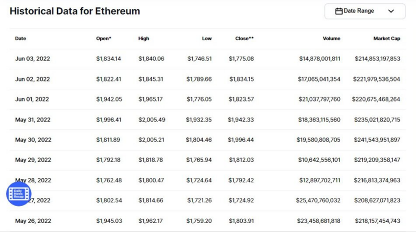 Em 12 de maio, o ETH abriu em US$ 2.072 e atingiu uma baixa intradiária de US$ 1.748. O volume negociado foi de cerca de US$ 42,46 bilhões e correspondeu a uma capitalização de mercado de aproximadamente US$ 236,88 bilhões.