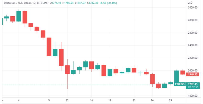 O ETH abriu, no dia 1º de maio, a US$ 2.730, atingiu uma alta mensal de US$ 2.957 em 5 de maio, testou uma mínima mensal de US$ 1.721 em 27 de maio e fechou o mês a um preço de US$ 1.942.