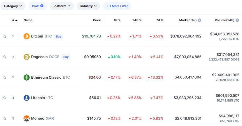 Agora, a Dogecoin se tornou a segunda maior rede que utiliza o mecanismo de prova de trabalho (PoW), segundo ranking do CoinMarketCap.