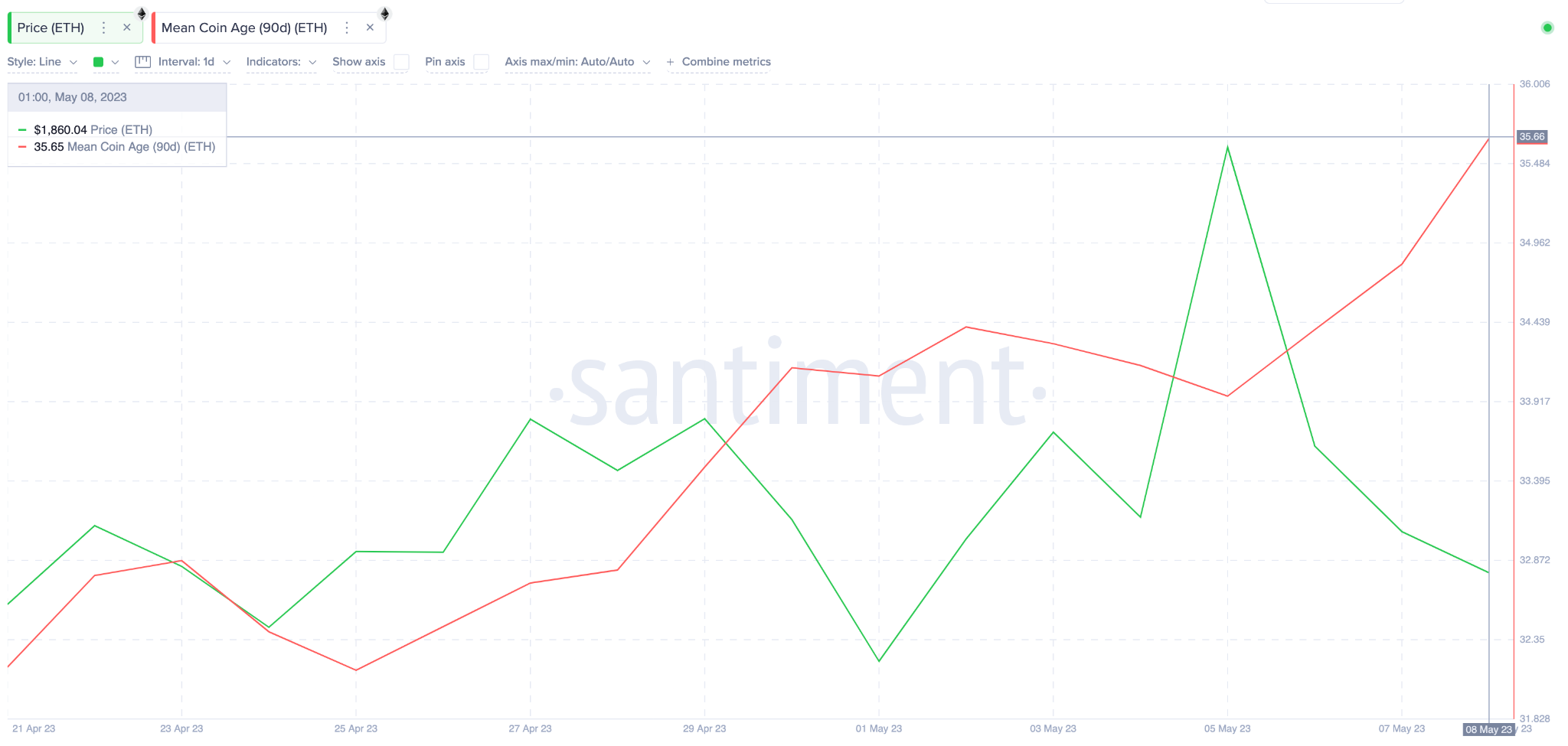 O Mean Coin Age avalia a média de dias que todas as moedas ETH em circulação permaneceram em seus endereços de carteira atuais Olhando para o gráfico abaixo, enquanto o preço caiu 7%, o ETH Mean Coin Age aumentou de 33,95 para 35,65 entre sexta-feira e domingo.
