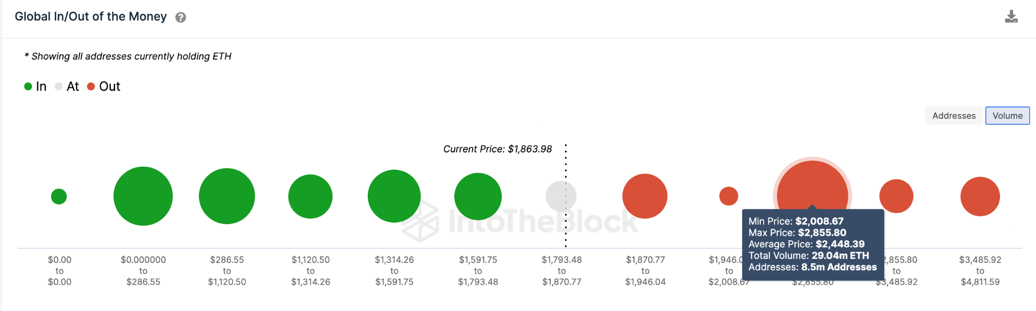 Do jeito que as coisas estão, é provável que o Ethereum se recupere para US$ 2.500. Mas, para que os detentores tenham confiança em uma reversão de alta, o ETH deve primeiro ultrapassar o nível de resistência de US$ 1.906. Nesse ponto, o grupo de 2,7 milhões de endereços que pagaram um preço médio de US$ 1.906 poderia vender parte de seus 8,8 milhões de moedas.