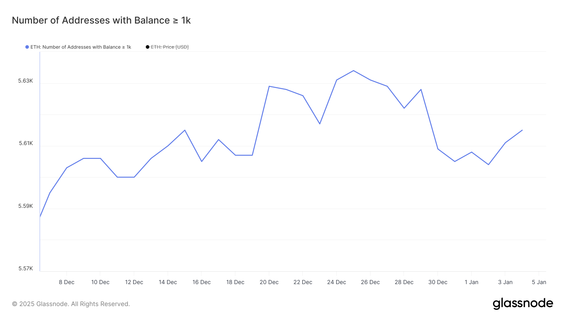 O número de baleias de Ethereum com pelo menos mil ETH atingiu um pico mensal de 5.634 em 25 de dezembro antes de cair para 5.604 em 2 de janeiro. Acompanhar a atividade das baleias é crucial porque esses grandes detentores podem influenciar significativamente as tendências do mercado.