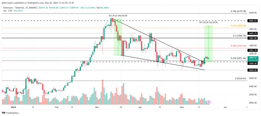 O preço do Ethereum, negociado a US$ 3.099 no fechamento da matéria, está acima do nível de retração de 0,236 de Fibonacci em US$ 3.031. Isso foi possível porque a altcoin saiu da cunha de baixa em que se encontrava desde o início de março.