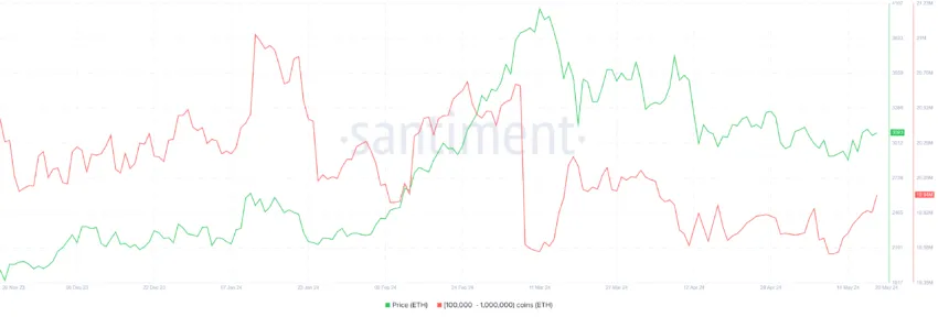 Os endereços que detêm entre 100.000 e 1 milhão de ETH adicionaram um pouco mais de 390.000 moedas na semana passada, uma oferta no valor de US$ 1,26 bilhão. Isso elevou as participações das baleias para 19,94 milhões de ETH.