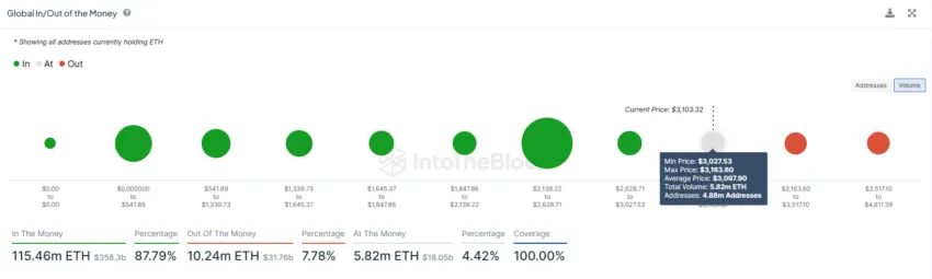 De acordo com o indicador Global In/Out of the Money (GIOM), a oferta foi comprada entre US$ 3.000 e US$ 3.163. Esse valor de US$ 18,65 bilhões de ETH deve manter os investidores e as baleias otimistas em relação a tendência futura.