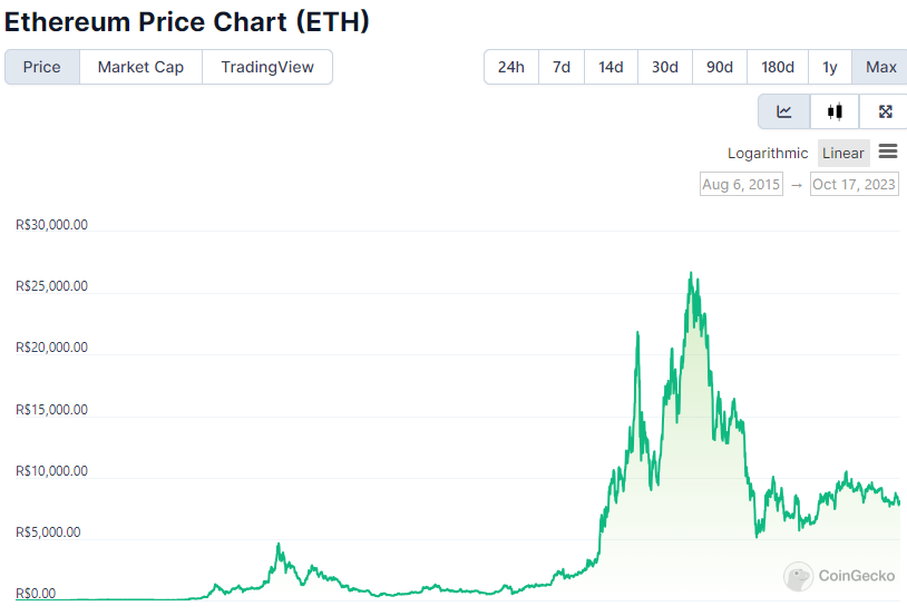 Apesar de ter tido uma valorização surpreendente desde o seu lançamento, o Ethereum, assim como as criptomoedas em geral, acumula uma forte desvalorização nos últimos dois anos. Atualmente, seu preço está 70% abaixo da sua máxima histórica de R$ 26.930.