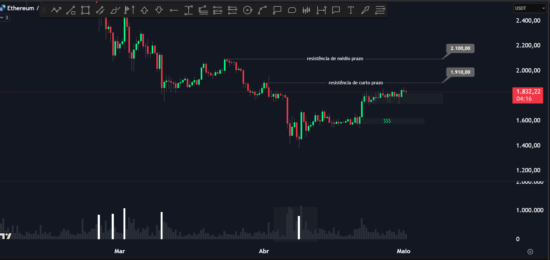SponsoredSegundo a análise de Ana de Mattos, trader parceira da Ripio, o rompimento da faixa de consolidação pode abrir espaço para novos avanços. Ela destaca que, caso o volume de compras continue aumentando, o ETH poderá testar resistências nas regiões de US$ 1.910 e, posteriormente, US$ 2.100. Essas zonas atuam como barreiras técnicas que concentram ordens de venda acumuladas ao longo das últimas semanas.