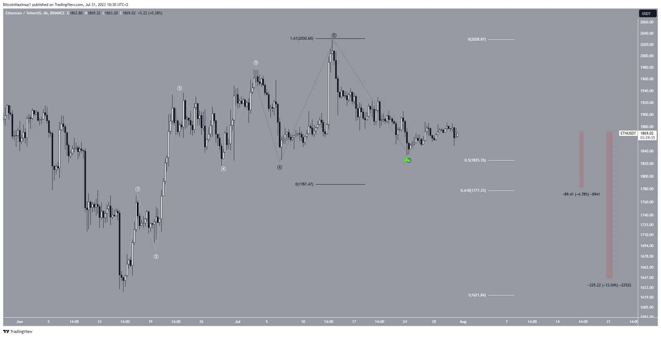 No entanto, definir as ondas A:C em uma proporção de 1:1,61 indica um potencial baixo em torno de US$ 1.780. Isso também coincide com o nível de suporte de retração de Fibonacci 0,618 (branco).