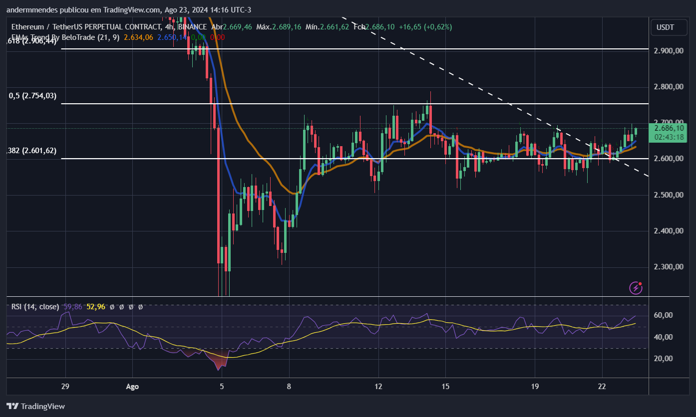 O gráfico de 4 horas, por sua vez, é mais otimista. Neste tempo gráfico podemos ver que o ETH está em consolidação entre US$ 2.600 – US$ 2.750 desde 8 de agosto. Apesar disso, a EMA de 9 períodos já está acima da EMA de 21 períodos, o que mostra que os compradores estão ganhando força.