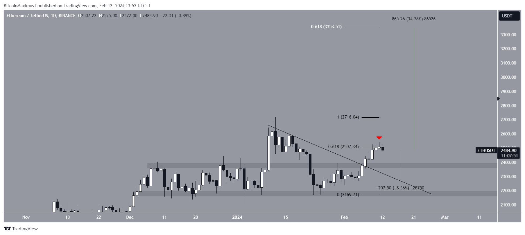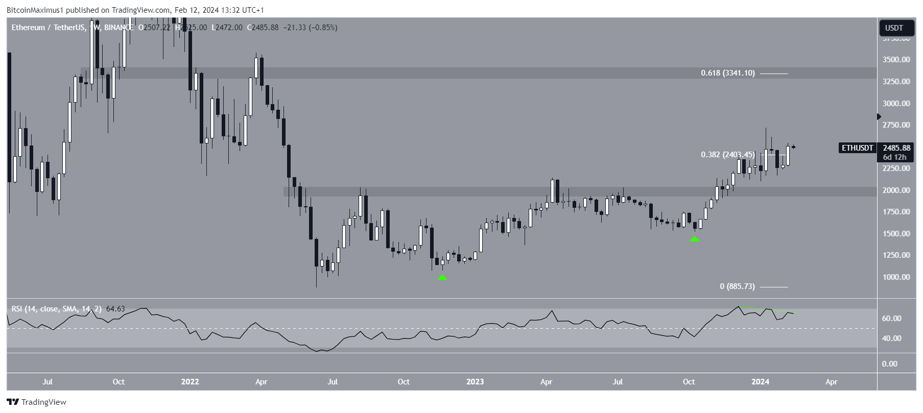 SponsoredEm novembro de 2023, o Ethereum rompeu um nível de resistência horizontal de longo prazo. Isso levou a uma alta de US$ 2.717 em janeiro de 2024, acima da resistência de retração 0,382 de Fibonacci. Após uma breve queda, o ETH voltou acima da resistência na semana passada, embora ainda não tenha atingido uma nova máxima anual.