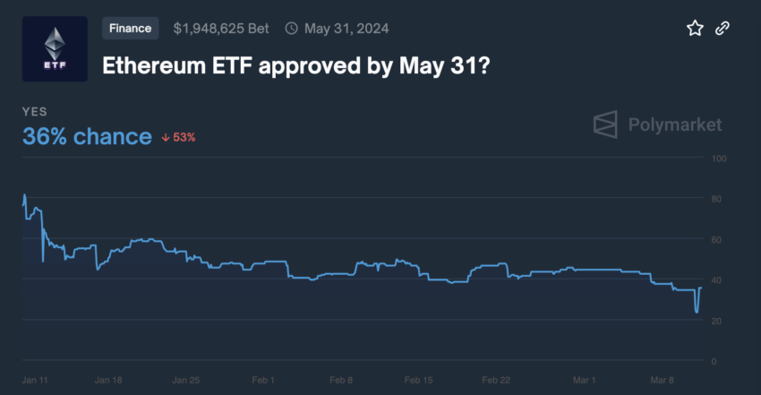 A probabilidade de um fundo negociado em bolsa (ETF) de Ethereum (ETH) ser aprovado nos Estados Unidos diminuiu para 36%. Esta queda acentuada moderou o entusiasmo dentro da comunidade.