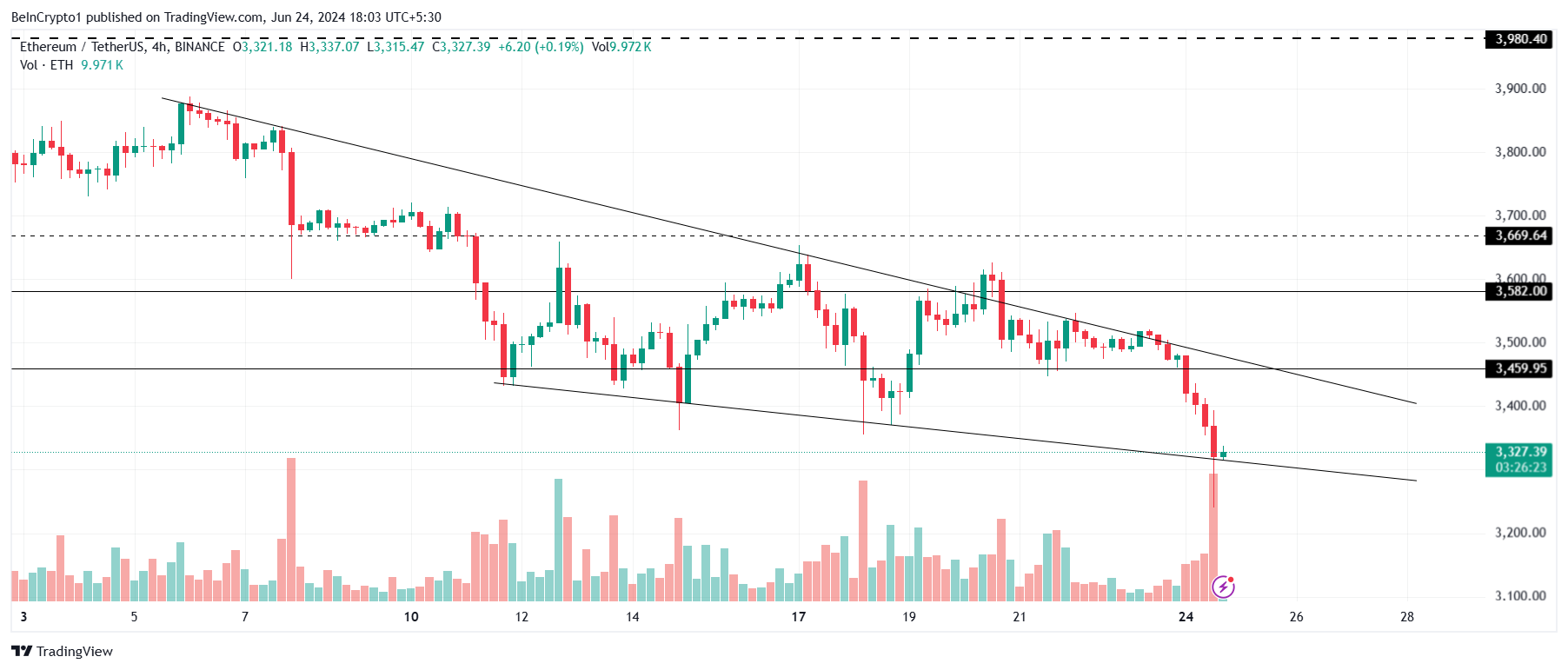 Mas, se o preço do Ethereum falhar no padrão altista, uma queda poderá levá-lo a US$ 3.000 ou menos. Isso invalidaria qualquer potencial de alta, ampliando as perdas dos investidores.