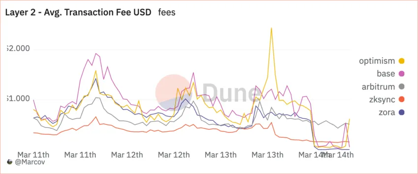 Após a atualização, a taxa média do Optimism caiu para US$ 0,05, enquanto a do Arbitrum caiu para US$ 0,5. A taxa média de transação na Base, blockchain da Coinbase, caiu para US$ 0,064, enquanto a da zkSyncEra caiu para US$ 0,161.