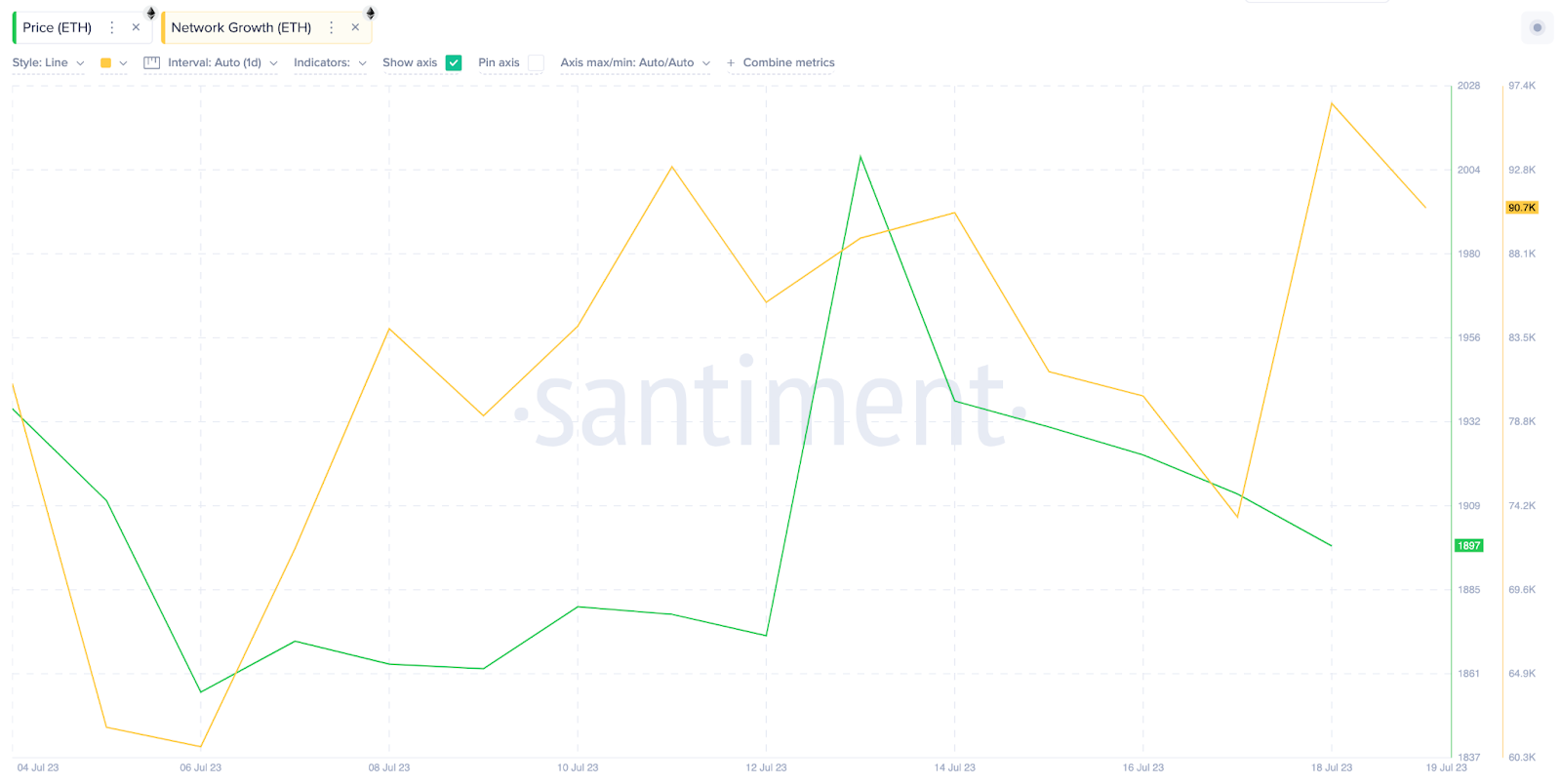 Além disso, a crescente taxa de aquisição de usuários do Ethereum sugere que a comunidade está ganhando impulso para a próxima alta. O gráfico abaixo mostra que o crescimento da rede está em alta desde 5 de julho.