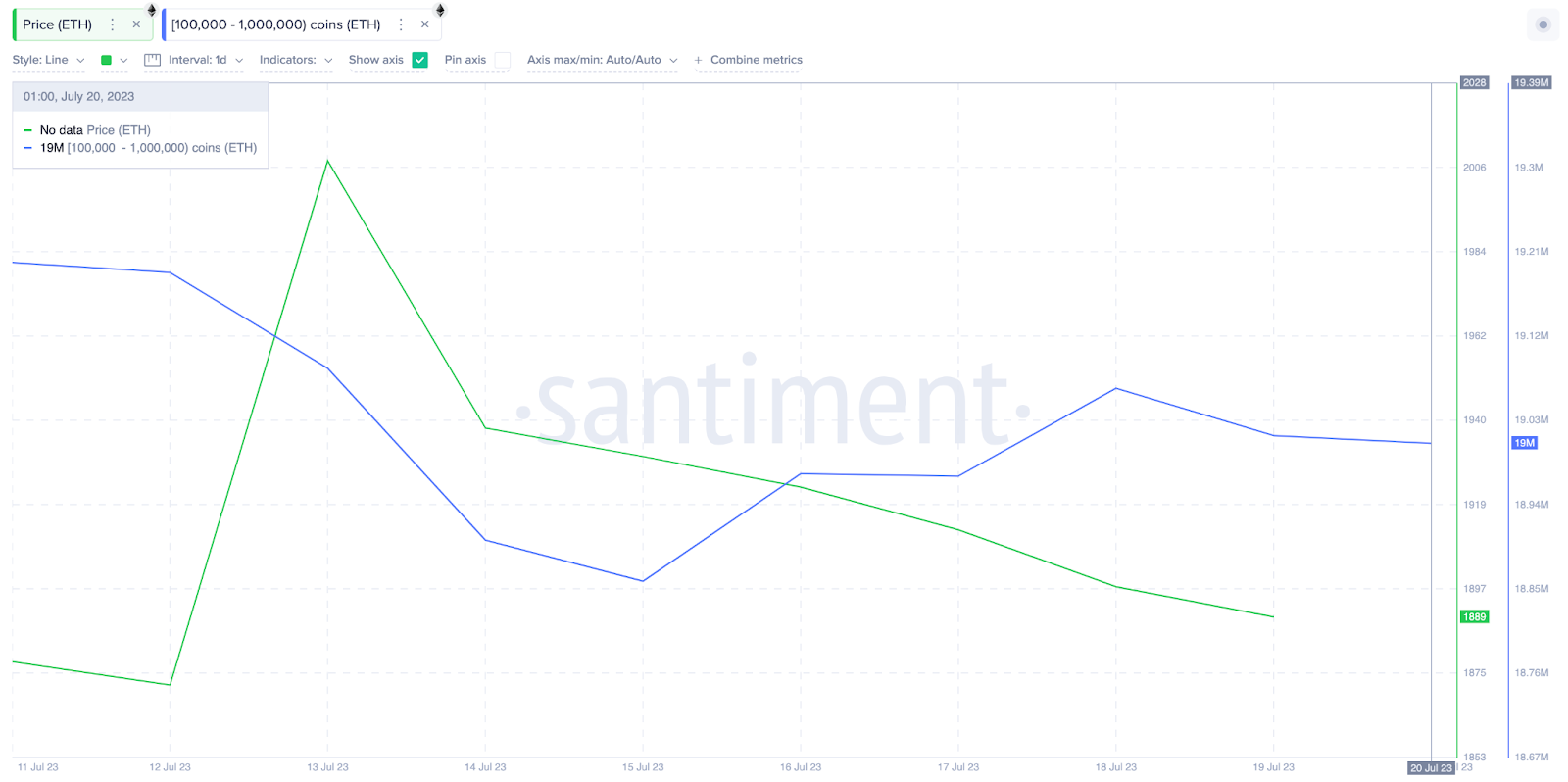 De acordo com os dados on-chain compilados pela Santiment, um grupo de baleias experientes entrou em ação para oferecer suporte esta semana. Como visto abaixo, os grandes investidores com 100.000 a 1 milhão de moedas adicionaram 150.000 ETH aos seus saldos entre 15 e 20 de julho.