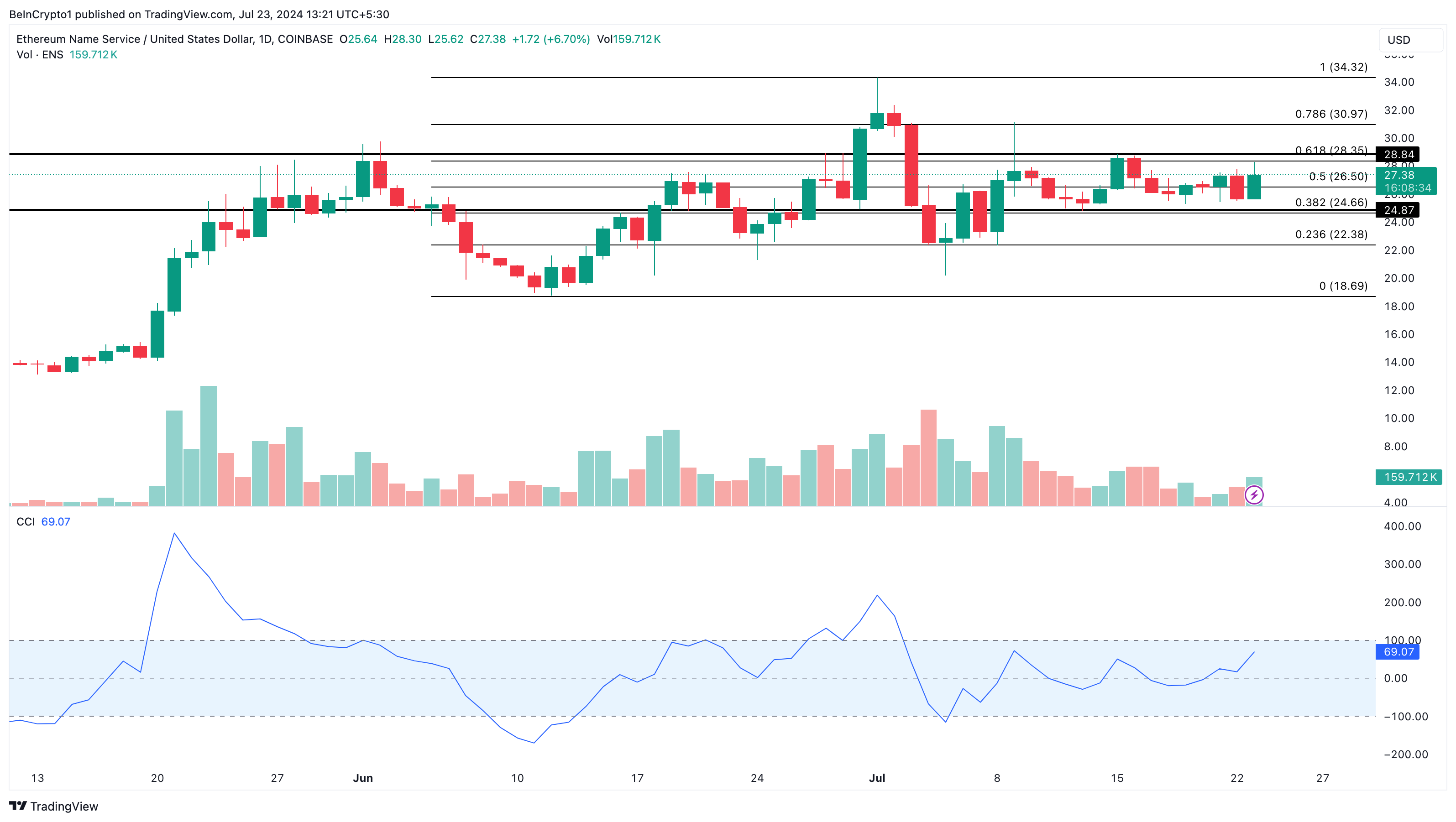 O gráfico diário ENS/USD mostra que o token vem se consolidando entre US$ 24,87 e US$ 28,84 há quase duas semanas. Além disso, essa negociação lateral pode continuar por algum tempo.