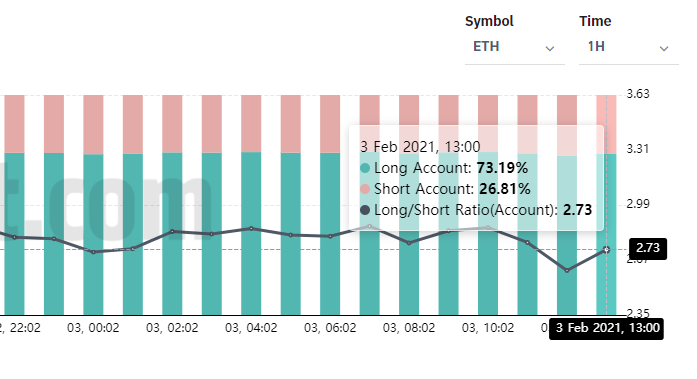 Traders de criptomoedas estão otimistas e esperam uma valorização ainda maior do Ethereum no curto prazo. Segundo a Bybt, mesmo com a nova máxima, as posições compradas em ETH não diminuem significativamente. Nas últimas horas, a proporção de comprados (longs) em relação a vendidos (shorts) se manteve acima de 70%.