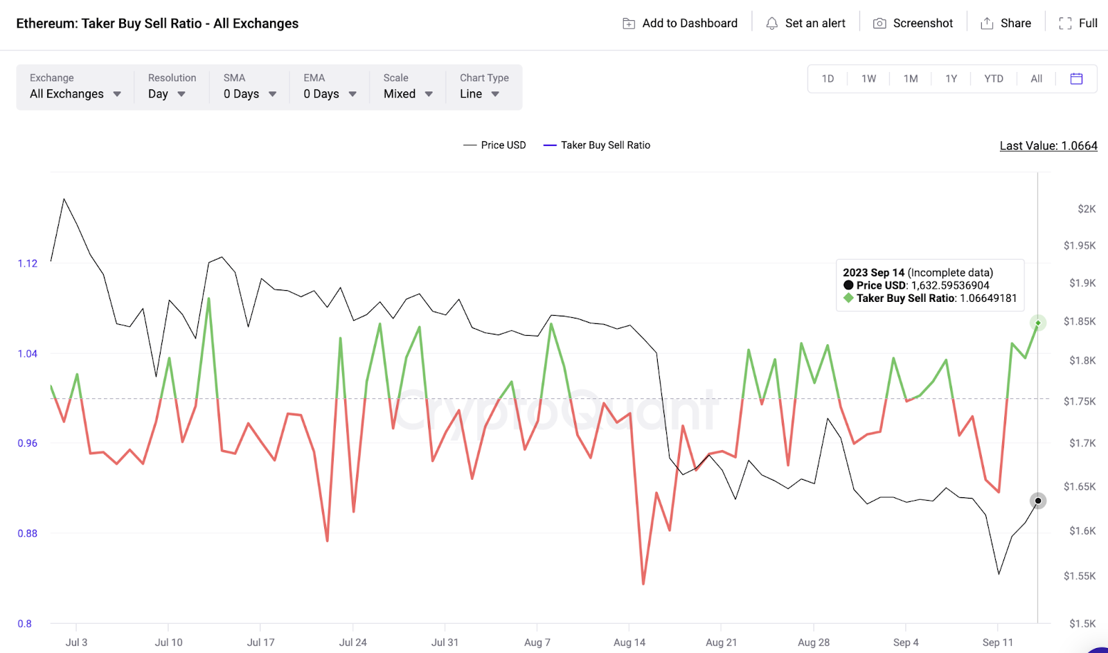 De acordo com dados do CryptoQuant, o índice ETH Taker Buy Sell atingiu valores positivos, alcançando um topo de 1,07 em 14 de setembro – seu maior valor em dois meses.