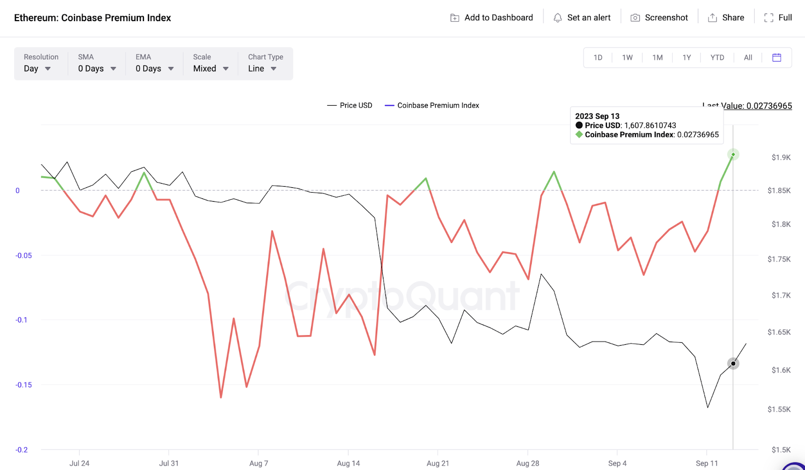A última vez que o Índice Premium Coinbase ultrapassou a faixa de 0,30 foi por volta de 13 de julho. E isso foi imediatamente seguido por uma alta de preços em direção a US$ 1.925. Curiosamente, isso não atraiu demanda de mercado suficiente para que o nível de US$ 1.930 fosse recuperado.
