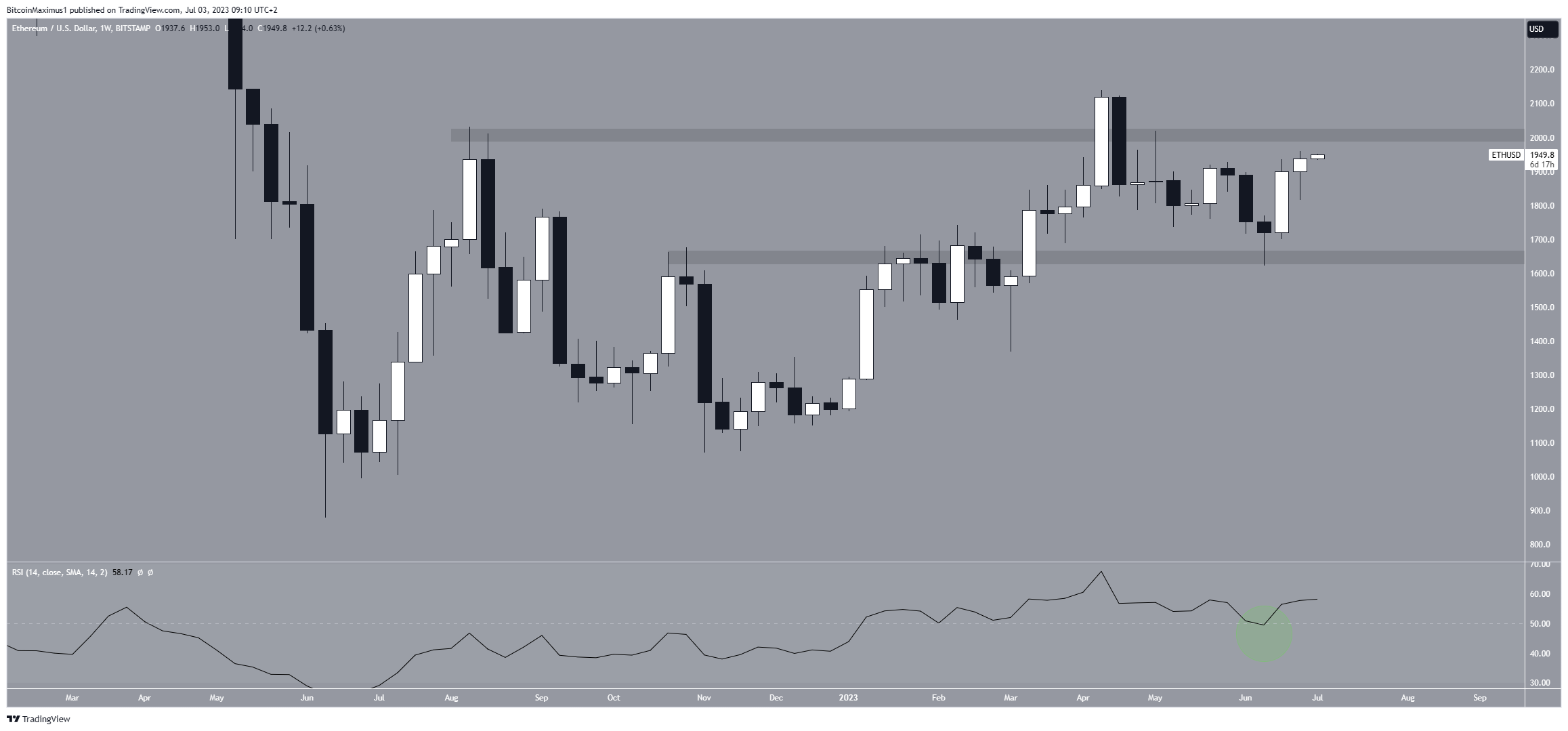 Essas sombras são consideradas sinais de alta, pois indicam que os vendedores não conseguiram derrubar o preço. O ETH entrou em tendência de alta desde então, culminando com um topo em US$ 1.960. O preço agora está muito próximo da área de resistência de US$ 2.000.
