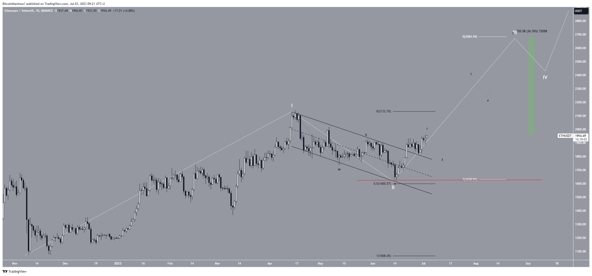 Portanto, o salto desde 15 de junho faz parte da onda três, que geralmente é a mais acentuada das ondas de alta. Dar às ondas um e três uma proporção de 1:1 levaria a um aumento para US$ 2.700. Medindo a partir do preço atual, isso equivaleria a um salto de 37%.