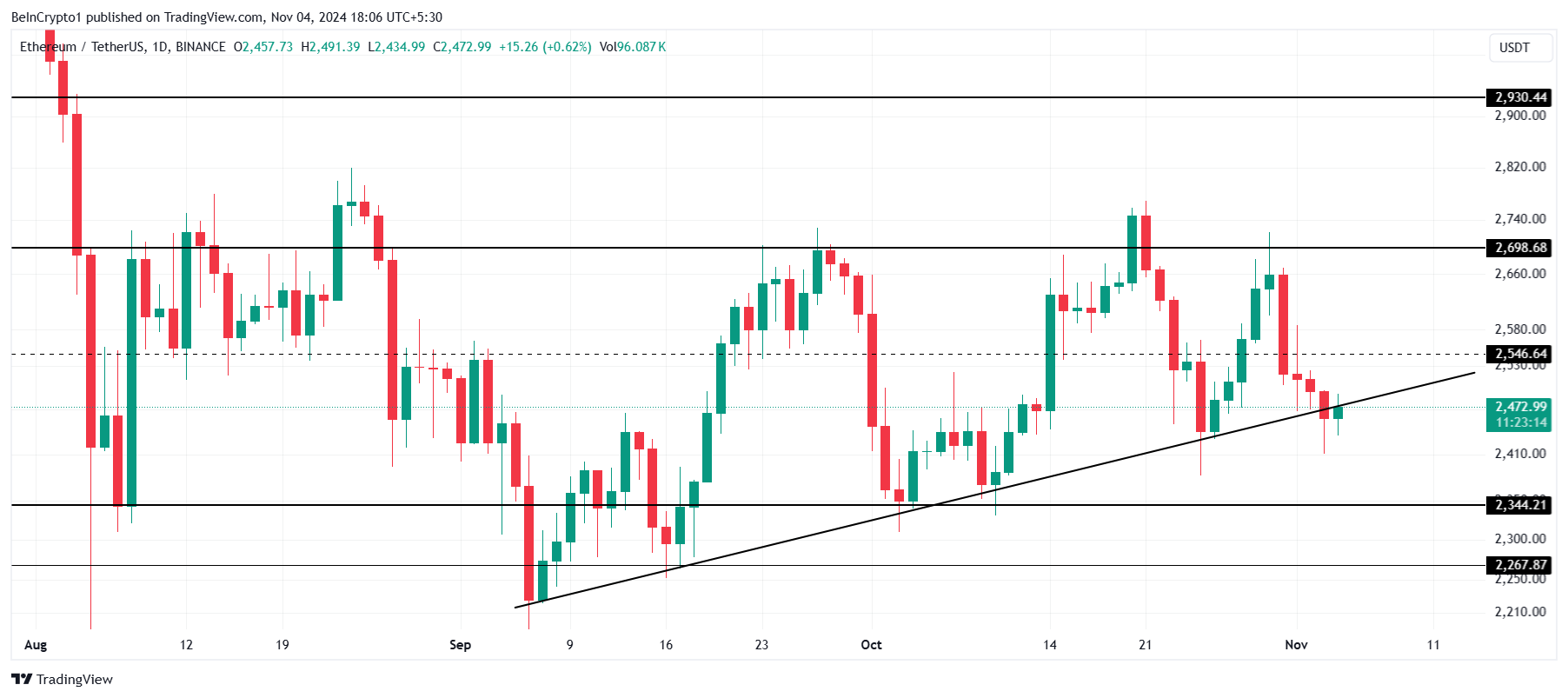 Para que a consolidação do Ethereum seja rompida, transformar US$ 2.700 em suporte será crucial. Alcançar esse nível confirmaria um salto de US$ 2.546, ajudando o ETH a manter sua linha de tendência de alta estabelecida em setembro. Manter-se acima desses níveis de suporte sinalizaria uma continuação da força do Ethereum.