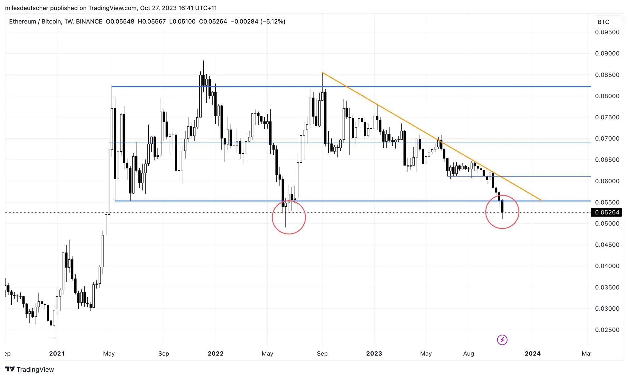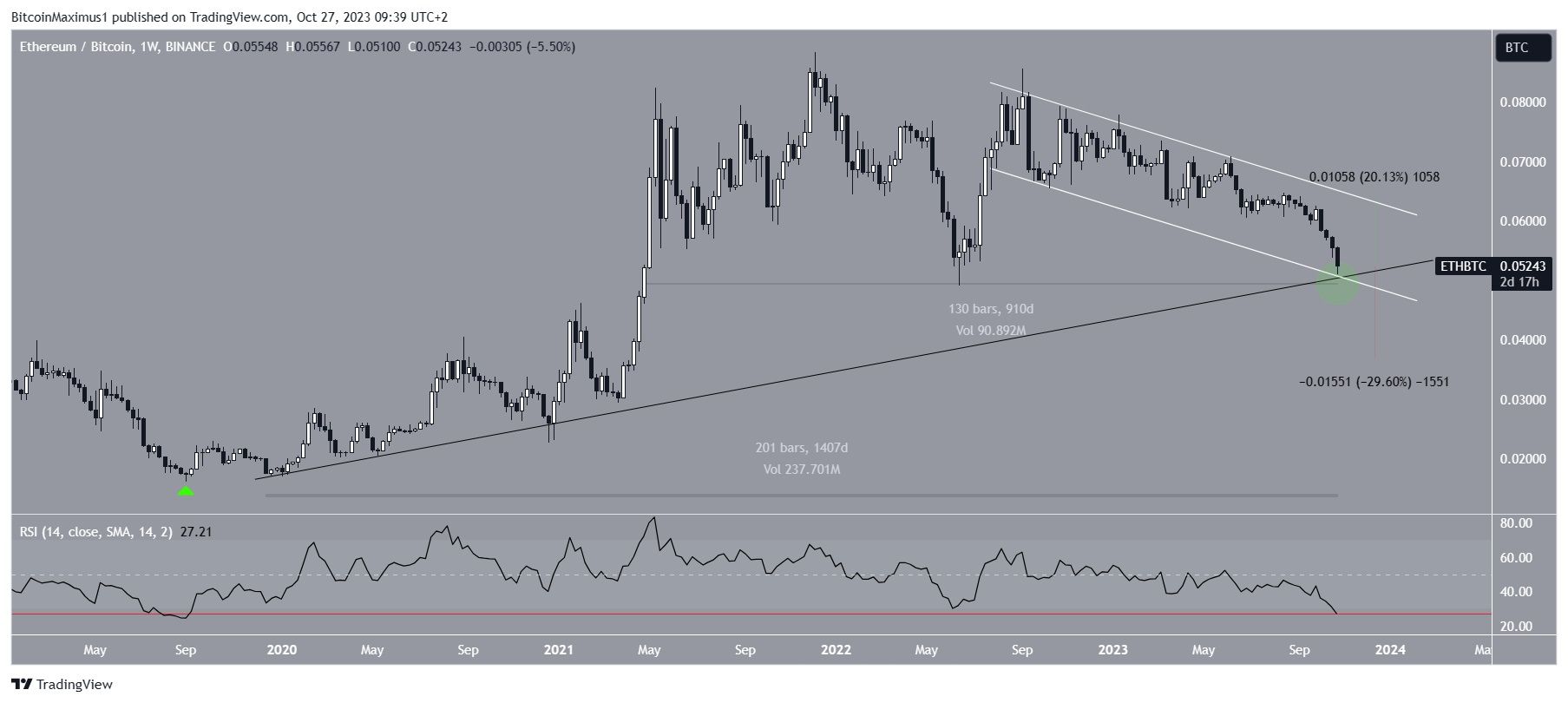 O Ethereum (ETH) quase caiu para o seu menor valor em 910 dias em relação ao preço do Bitcoin (BTC).