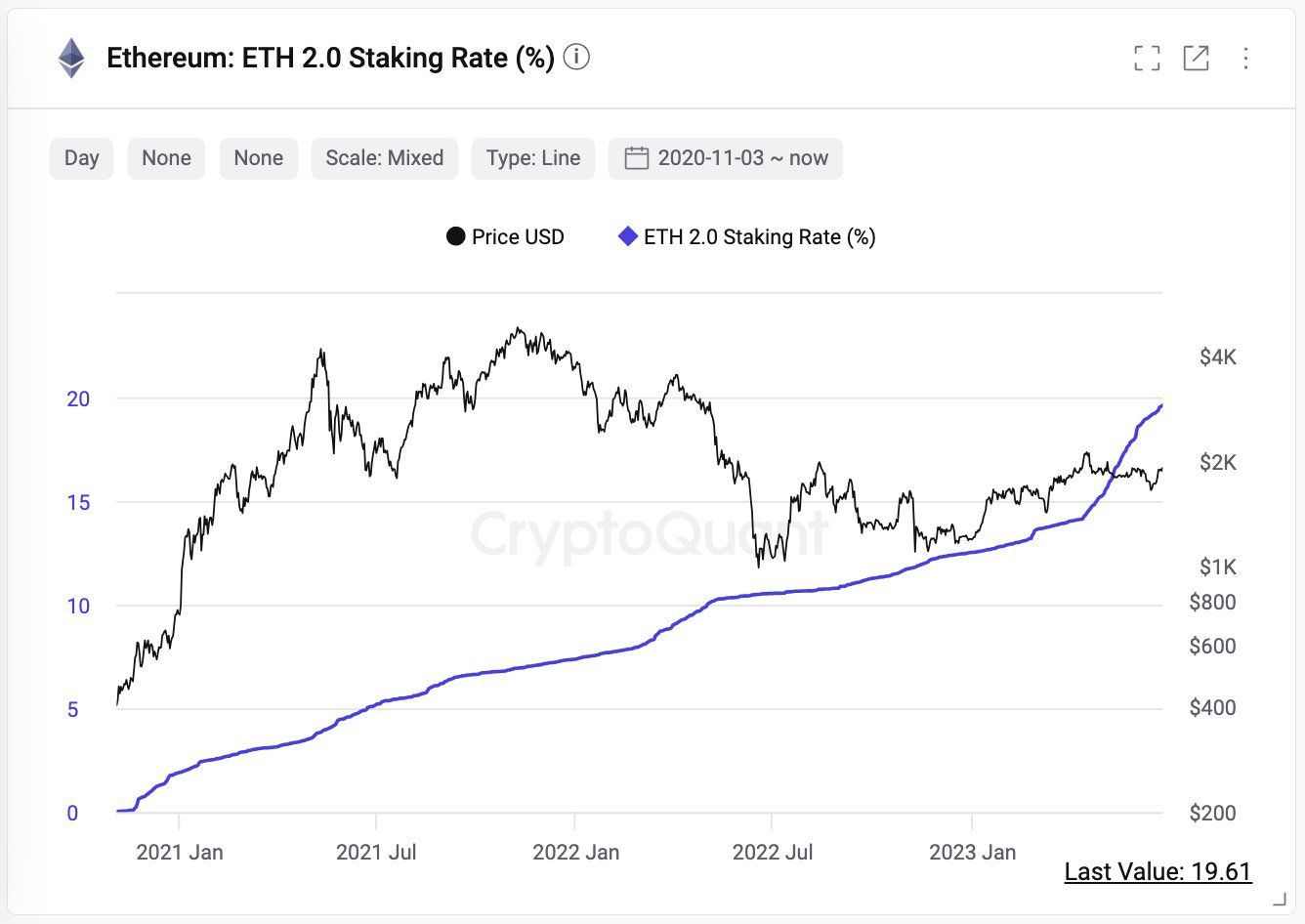 De acordo com a plataforma de análises on-chain, quase 20% da oferta de ETH agora está depositada nesta atividade. Além disso, houve um forte aumento de 5% nos últimos dois meses.