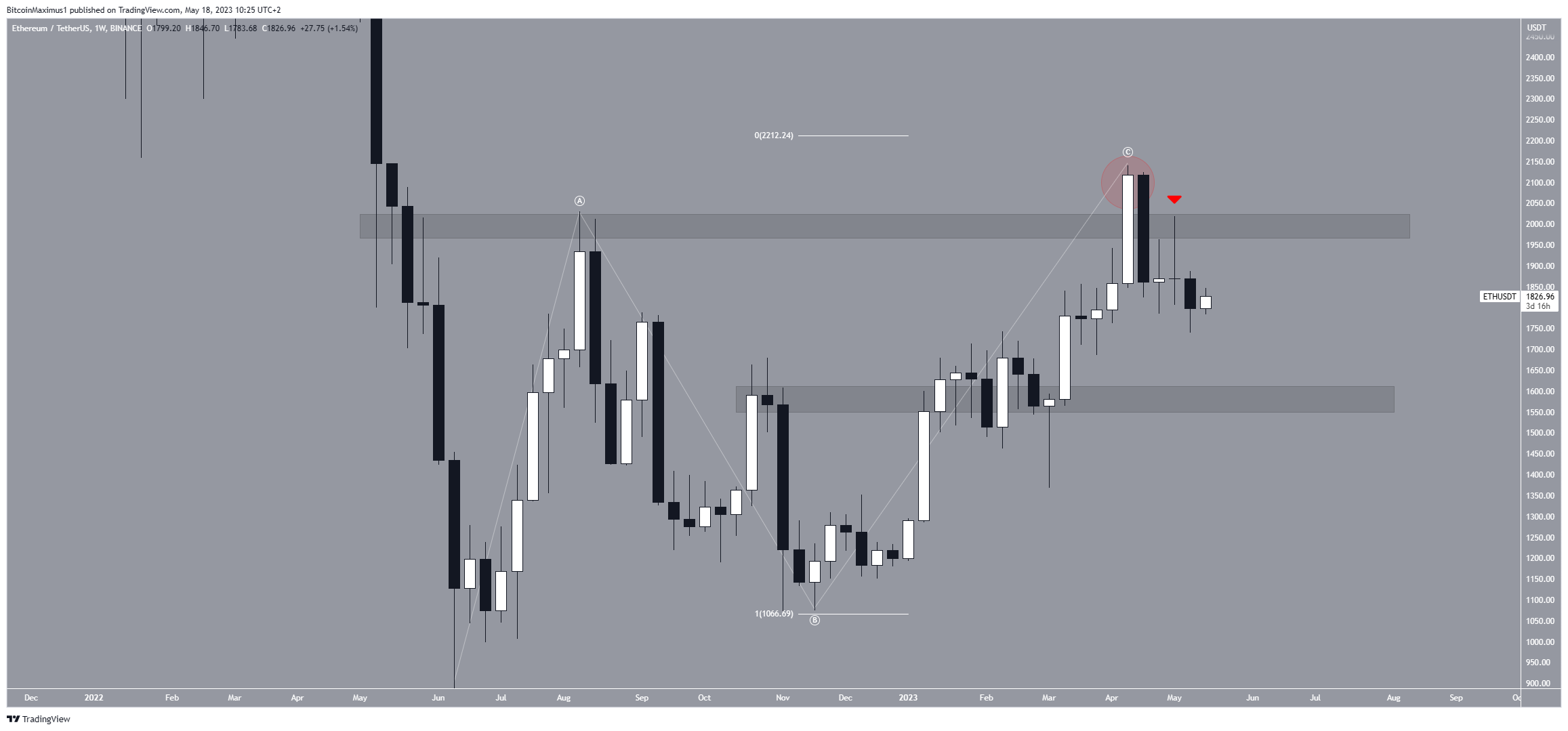 No início de abril, o preço do Ethereum atingiu uma máxima anual de US$ 2.151, ficando acima da área de resistência de US$ 1.950. No entanto, após uma queda significativa na semana seguinte, o preço caiu abaixo da área e o validou como resistência (ícone vermelho).