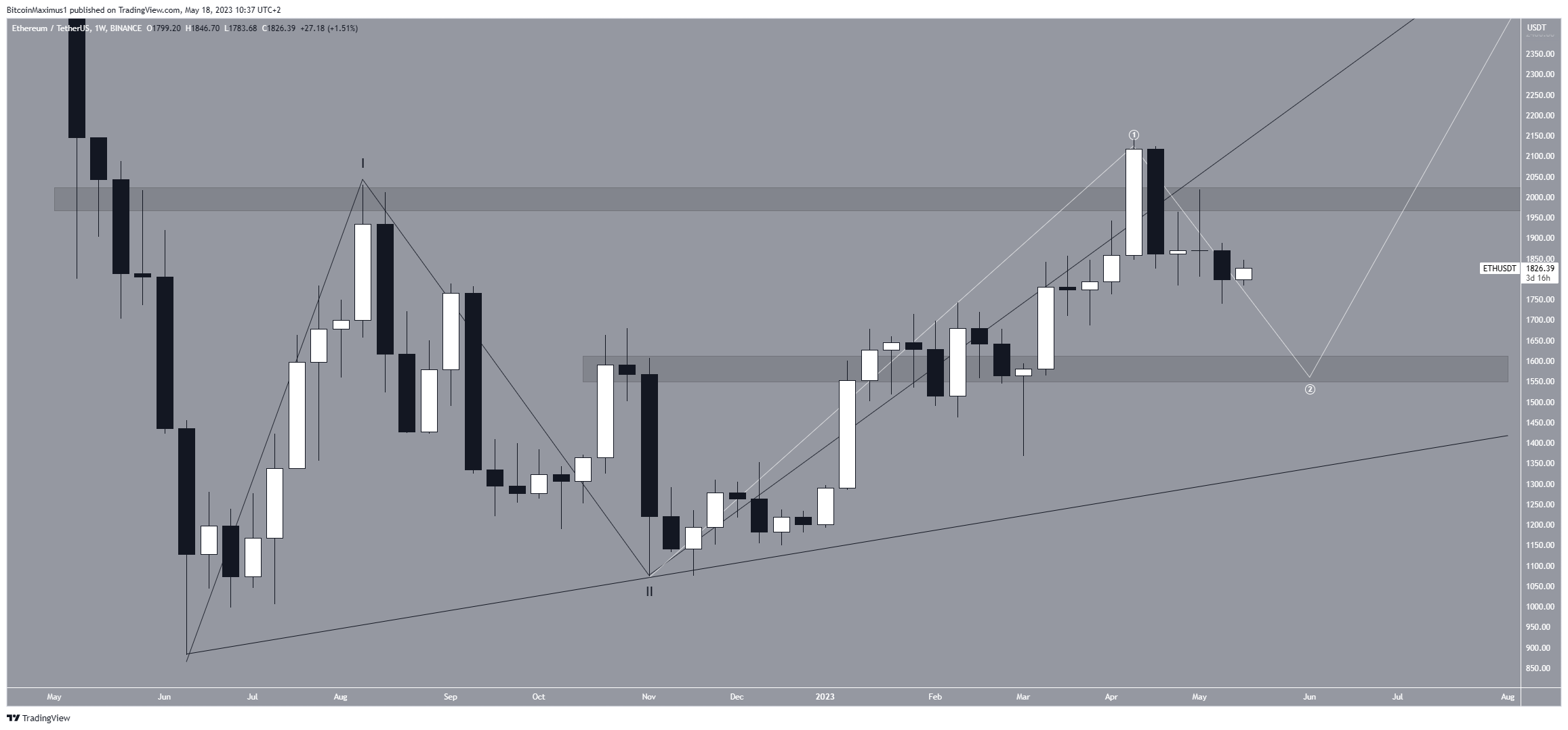 Para que a contagem esteja correta, o ETH precisa saltar na área de suporte de US$ 1.600 e iniciar um movimento acentuado acima de US$ 2.000. Como o segundo 1-2 deve ter uma inclinação mais acentuada do que o primeiro, uma quebra abaixo da inclinação do primeiro (preto) invalidará a contagem.