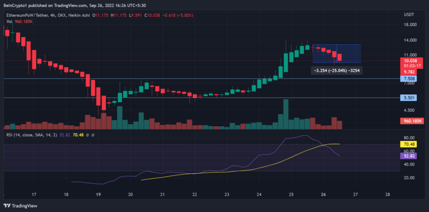 Apesar de uma listagem na KuCoin, a ETHW não conseguiu se manter acima dos principais níveis de suporte, perdendo mais de 20% do preço em questão de poucas horas nesta segunda-feira (26).