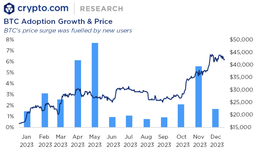Um relatório recente da Crypto.com revela que o Bitcoin testemunhou um aumento de 33% na sua base de usuários, passando de 222 milhões em janeiro para 296 milhões em dezembro. Curiosamente, este aumento é responsável por 51% da adoção global cripto.