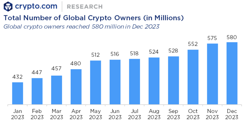 “A adoção cripto em 2023 alcançou novos marcos, com o número de proprietários de criptomoedas atingindo 580 milhões, apesar dos ventos contrários macro, nomeadamente o maior aperto monetário por parte dos bancos centrais ocidentais para tentar domar a inflação, o conflito cinético prolongado na Europa e um novo no Oriente Médio e as consequências de longo prazo da pandemia”, escreveram os analistas da Crypto.com.