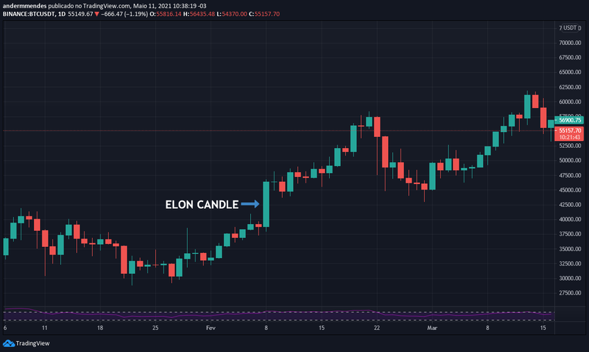Durante o dia, o Bitcoin chegou a valorizar quase 20%, saltando da zona dos US$ 39.000 para o preço recorde da época, de aproximadamente US$ 46.500. A movimentação do preço no gráfico diário do BTC ficou conhecida como “Elon Candle”.