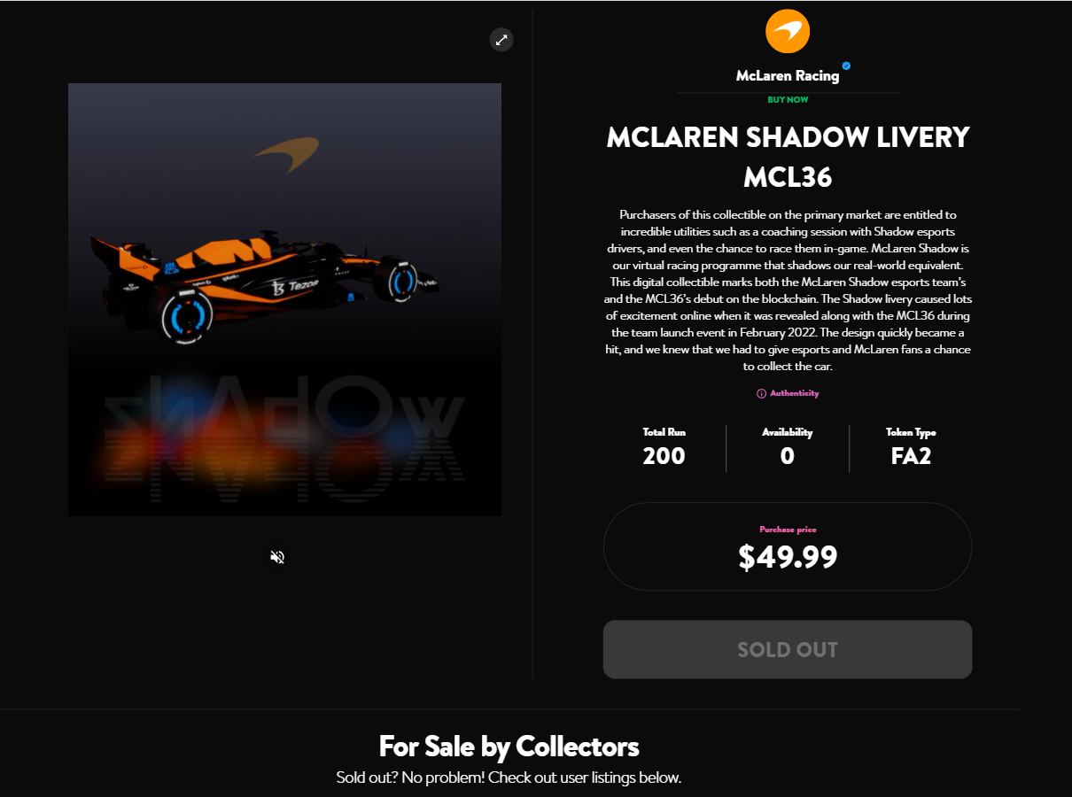 A McLaren disponibilizou alguns Fan Tokens Shadow para os usuários resgatarem o primeiro NFT da estreia de maneira gratuita através de um QR code durante uma das transmissões do McLaren Shadow Twitch. Eles se esgotaram em menos de 48 horas e já estão sendo negociados no mercado secundário com preços que chegam a US$ 16.900.