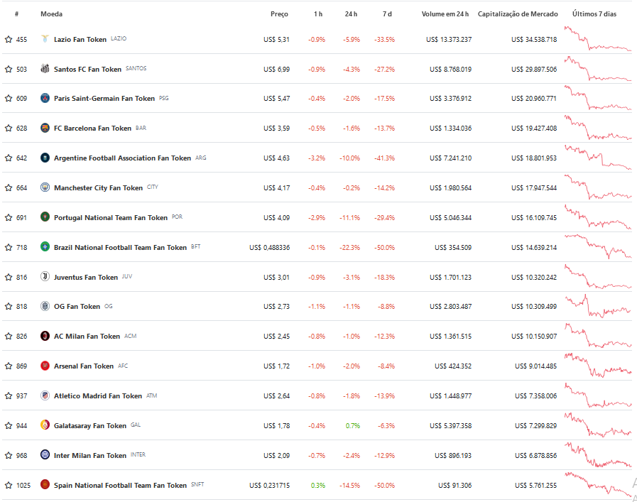 Apesar disso, os resultados não foram suficientes para impulsionar o preço dos seus respectivos fan tokens, que operam em forte queda. O maior destaque negativo ficou com o ativo da seleção brasileira, o BFT.