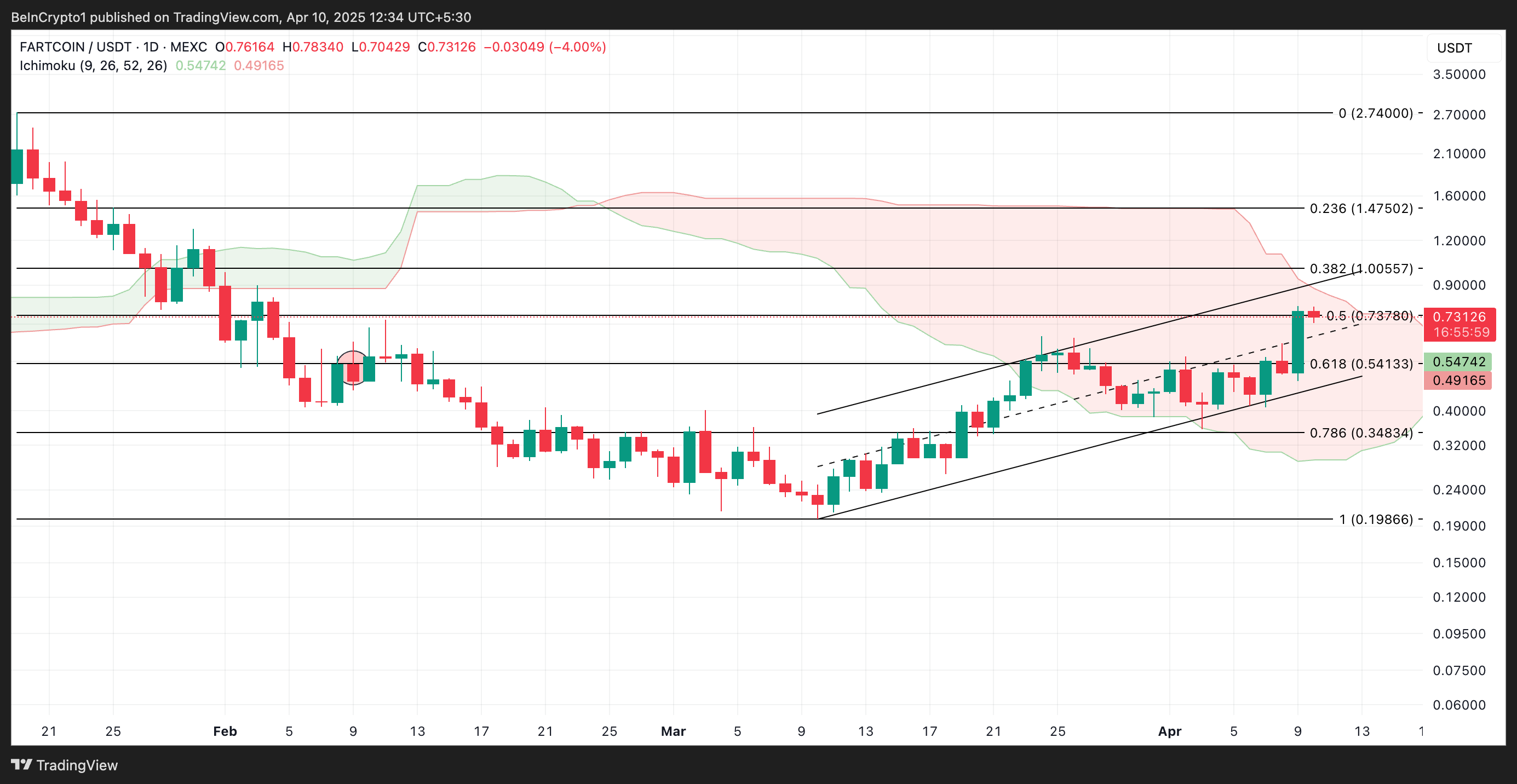 No gráfico diário, o rali de três dígitos da altcoin elevou seu preço acima do Leading Span A (linha verde) de sua Ichimoku Cloud. O fortalecimento do impulso de alta agora está levando a memecoin em direção ao Leading Span B (linha vermelha) deste indicador, cuja quebra validaria ainda mais a atual corrida de alta da Fartcoin.