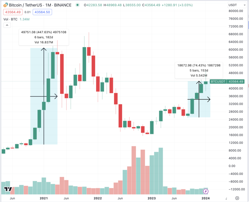 A tendência atual do Bitcoin sustenta esse otimismo. Assim, a criptomoeda está no caminho para seu quinto mês consecutivo de ganhos, com um ganho de 3% em janeiro de 2024, uma sequência não vista desde o período de 2020-21.