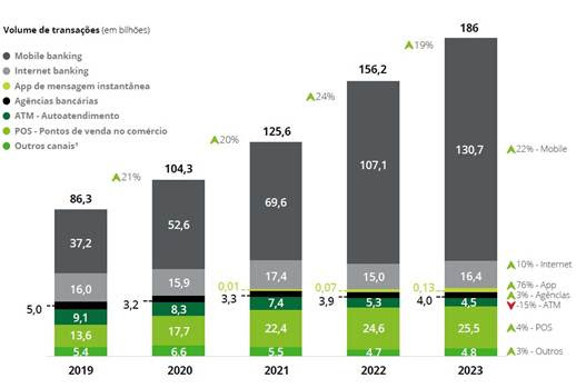 Além disso, o uso total de serviços bancários também cresceu substancialmente, com um aumento de 19% no número total de transações em 2023, totalizando 186 bilhões.
