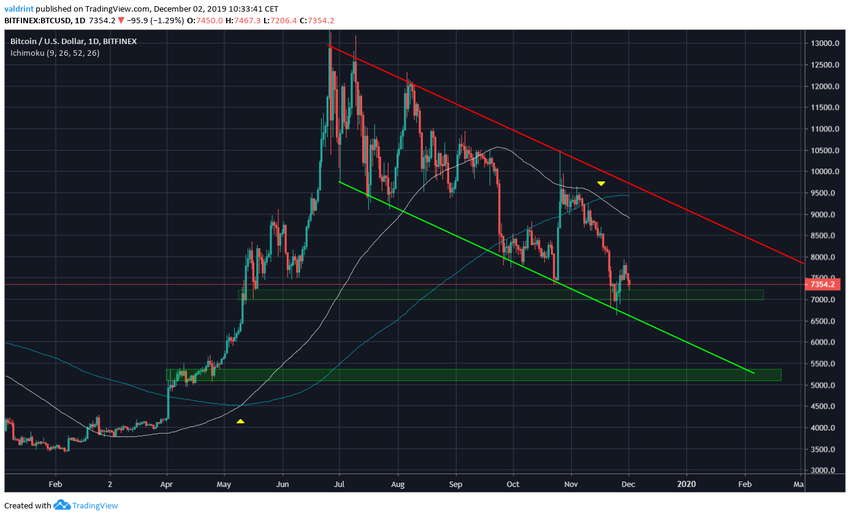 Observando o gráfico diário, podemos ver que o BTC está sendo negociado dentro de um canal descendente. Ele saltou na linha de suporte em 25 de novembro e vem aumentando desde então. Esse movimento solidificou forte apoio acima de US $ 7000.