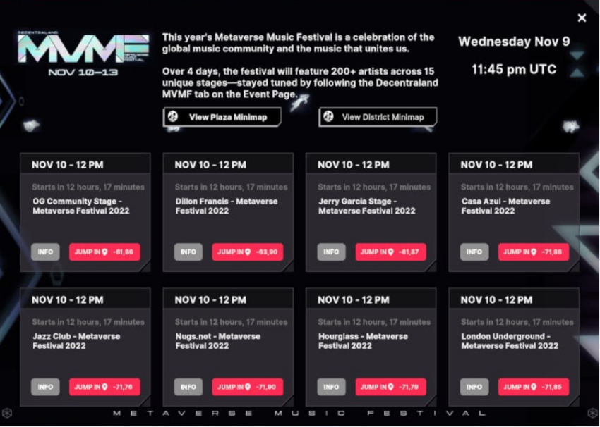 Decentraland, lançado em 2020, é um mundo social virtual. Ele é alimentado pela blockchain Ethereum e afirma ser o primeiro metaverso descentralizado. Esta plataforma de realidade virtual sediará o festival de música de 10 a 13 de novembro.