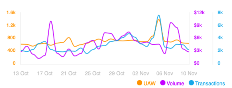 O Decentraland mantém um UAW (Unique Active Wallets) estável de cerca de 800 diariamente desde maio – uma tendência que ainda se mantém até hoje. De acordo com os dados do DappRadar, o UAW da plataforma principal é de 645, como visto no gráfico abaixo.