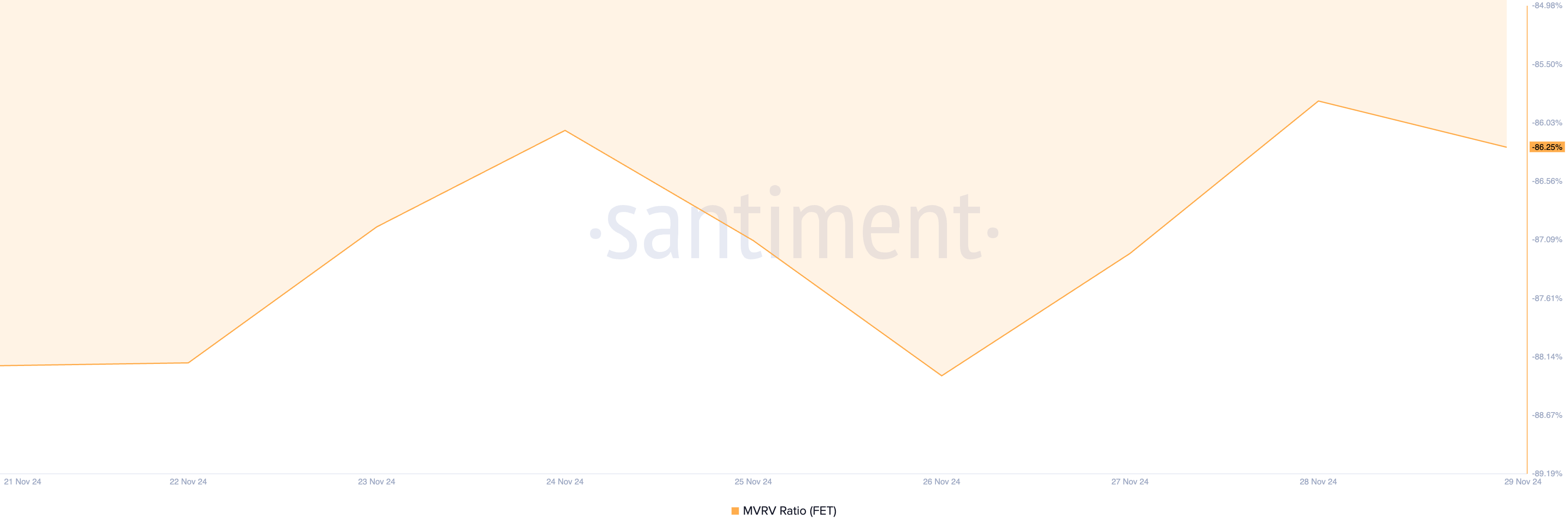 Este aumento na acumulação de baleias está sendo amplamente atribuído ao status subvalorizado da FET. Conforme indicado por sua relação negativa de valor de mercado para valor realizado (MVRV). A Santiment relata que a relação MVRV atual da FET é de -86,25%.