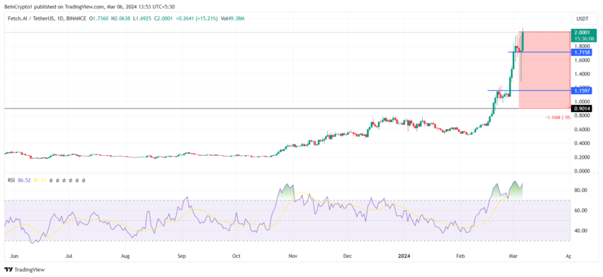 Além disso, o Índice de Força Relativa (RSI) mostra que o FET está atualmente sobrecomprado, um sinal de saturação do sentimento de alta.