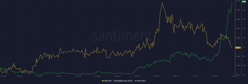 Estes endereços, que detêm entre 100.000 e 1 milhão de FET, parecem ter uma mentalidade oposta à dos investidores de varejo. Além disso, a sua atividade ditou a ação do preço do FET no passado, uma vez que a sua compra levou a um aumento no preço, enquanto a venda contínua causou quedas de preços.