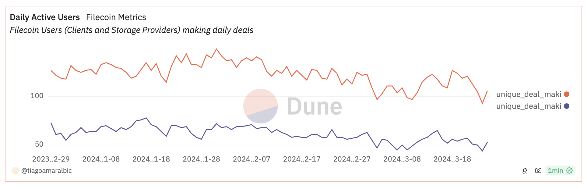 Essa redução progressiva no envolvimento dos usuários é alarmante, pois destaca um declínio contínuo sem a presença de períodos de recuperação notáveis para contrabalançar essa tendência de queda. O fato de não ter havido nenhuma queda diária drástica pode não parecer preocupante, mas a perda constante de usuários ativos ao longo do tempo mostra uma tendência preocupante: o Filecoin está lenta, mas seguramente, perdendo seu ímpeto de crescimento.