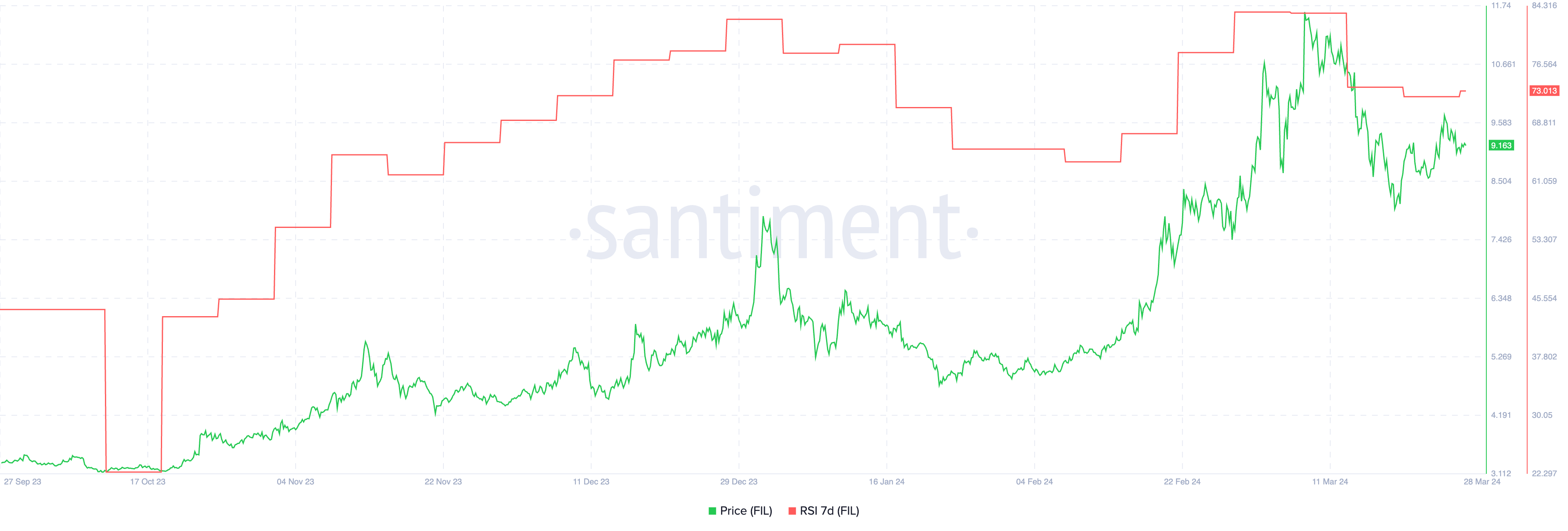 O RSI de 7 dias do Filecoin está em 73, registrando uma queda notável em relação a uma alta de 83 há três semanas. Essa mudança é significativa no contexto do comportamento do mercado da FIL, sugerindo uma fase de consolidação após um período de vigorosa atividade comercial.
