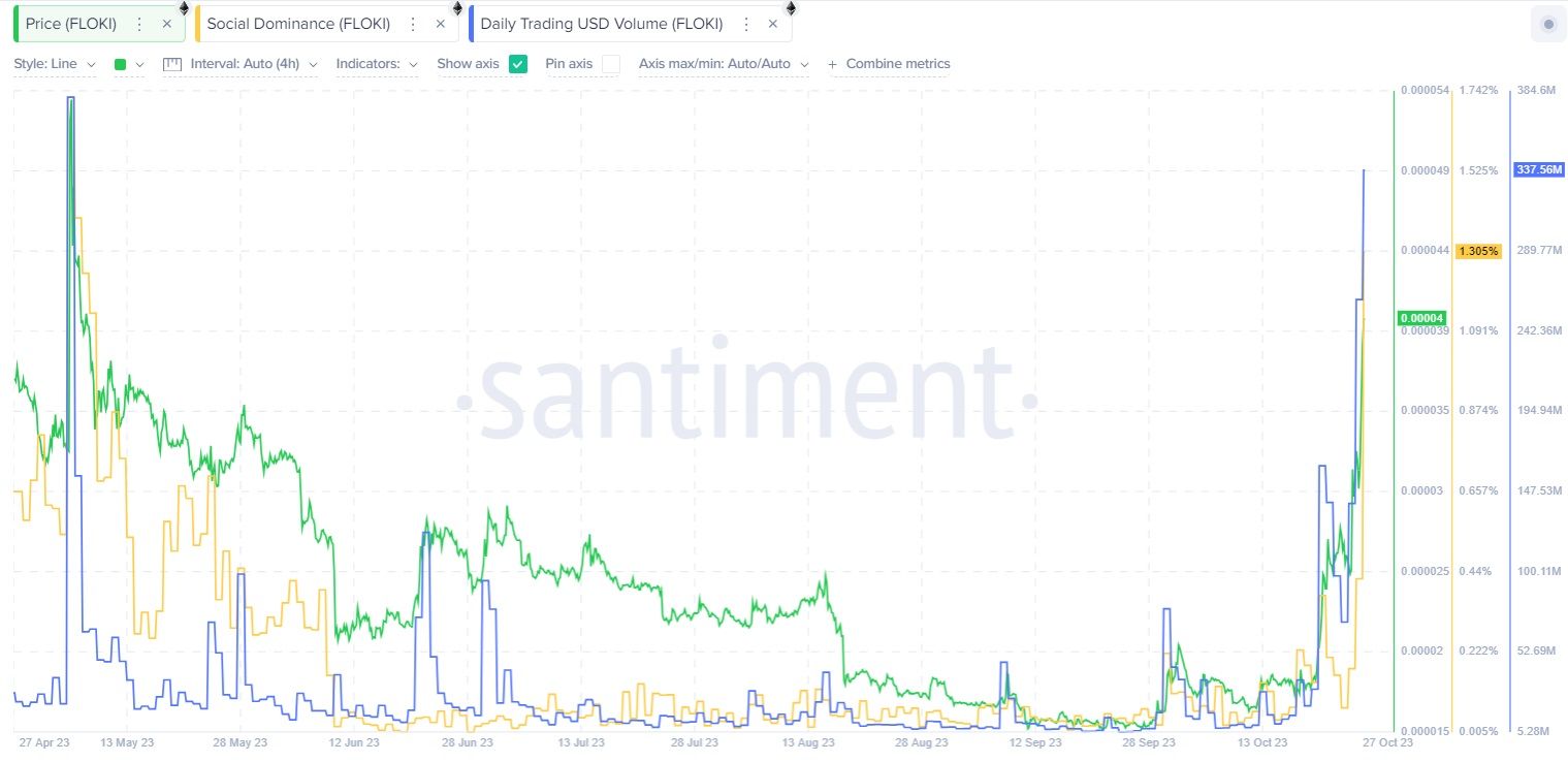 Os dados sociais mostram um interesse renovado do mercado pela FLOKI (laranja). Além disso, o volume de negociações atingiu US$ 337 milhões, mais do que o da Shiba Inu (SHIB), que tem um volume diário de US$ 260 milhões.