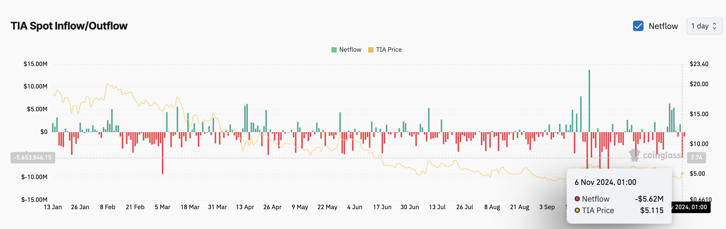 Ontem (6), dados da Coinglass revelaram uma leitura negativa para a métrica de fluxo de entrada/saída, que rastreia o movimento de tokens para dentro e fora das exchanges. Essa leitura específica sugere uma mudança otimista, já que cerca de US$ 5,62 milhões em TIA saíram das exchanges.
