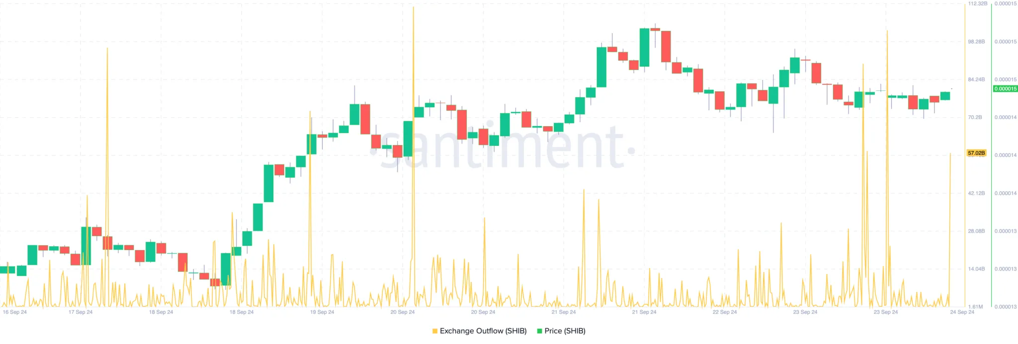 No início dessa semana, o fluxo de saída de Shiba Inu nas exchanges era inferior a 4 bilhões. Já nesta terça-feira (24), essa mesma métrica disparou para 57,02 bilhões, segundo dados da Santiment.